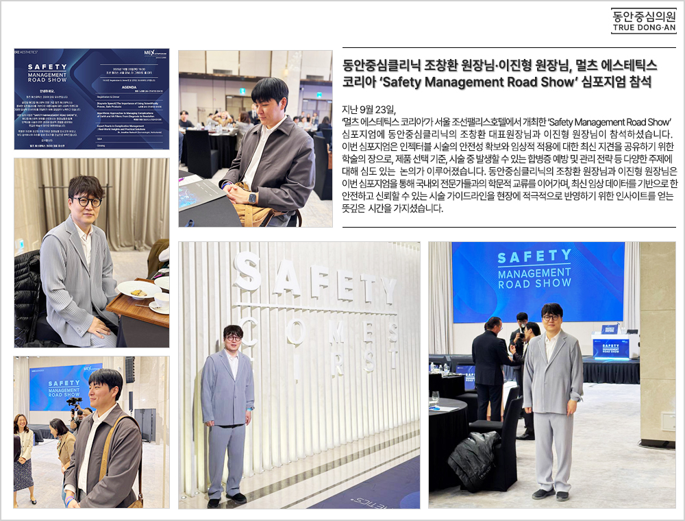 지난 9월 23일, ‘멀츠 에스테틱스 코리아‘가 서울 조선팰리스호텔에서 개최한 ‘Safety Management Road Show’ 심포지엄에 동안중심클리닉의 조창환 대표원장님과 이진형 원장님이 참석하셨습니다. 이번 심포지엄은 인젝터블 시술의 안전성 확보와 임상적 적용에 대한 최신 지견을 공유하기 위한 학술의 장으로, 제품 선택 기준, 시술 중 발생할 수 있는 합병증 예방 및 관리 전략 등 다양한 주제에 대해 심도 있는 논의가 이루어졌습니다. 동안중심클리닉의 조창환 원장님과 이진형 원장님은 이번 심포지엄을 통해 국내외 전문가들과의 학문적 교류를 이어가며, 최신 임상 데이터를 기반으로 한 안전하고 신뢰할 수 있는 시술 가이드라인을 현장에 적극적으로 반영하기 위한 인사이트를 얻는 뜻깊은 시간을 가지셨습니다. ![]() |