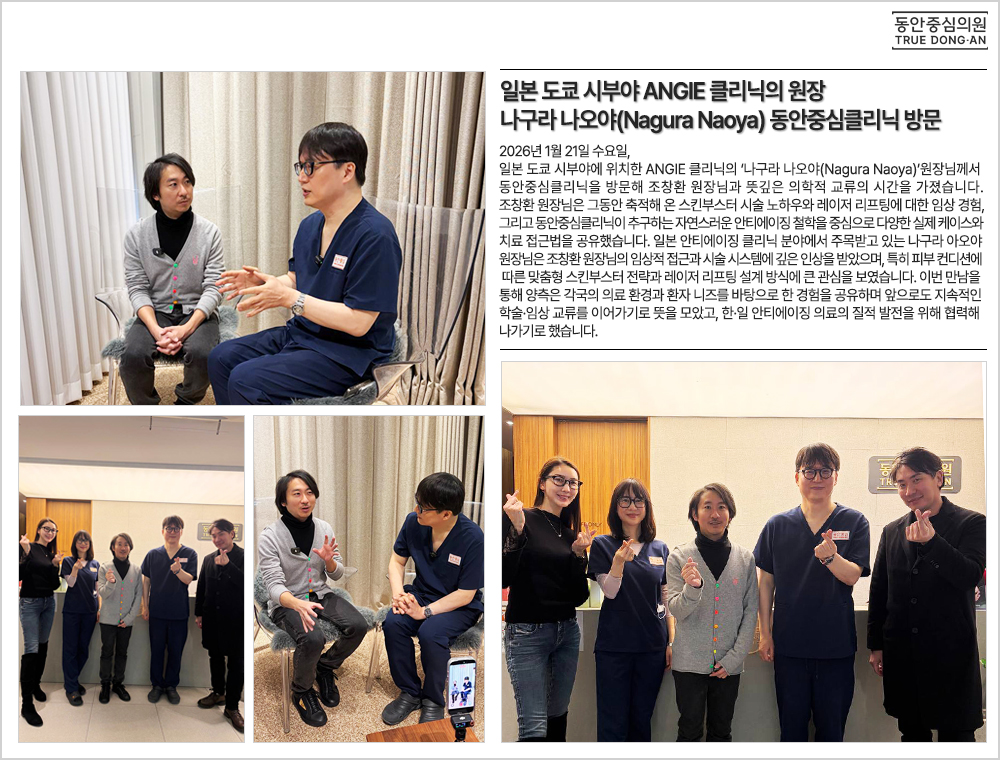 2026년 1월 21일 수요일, 일본 도쿄 시부야에 위치한 ANGIE 클리닉의 ‘나구라 나오야(Nagura Naoya)’원장님께서 동안중심클리닉을 방문해 조창환 원장님과 뜻깊은 의학적 교류의 시간을 가졌습니다. 조창환 원장님은 그동안 축적해 온 스킨부스터 시술 노하우와 레이저 리프팅에 대한 임상 경험, 그리고 동안중심클리닉이 추구하는 자연스러운 안티에이징 철학을 중심으로 다양한 실제 케이스와 치료 접근법을 공유했습니다. 일본 안티에이징 클리닉 분야에서 주목받고 있는 나구라 아오야 원장님은 조창환 원장님의 임상적 접근과 시술 시스템에 깊은 인상을 받았으며, 특히 피부 컨디션에 따른 맞춤형 스킨부스터 전략과 레이저 리프팅 설계 방식에 큰 관심을 보였습니다. 이번 만남을 통해 양측은 각국의 의료 환경과 환자 니즈를 바탕으로 한 경험을 공유하며 앞으로도 지속적인 학술·임상 교류를 이어가기로 뜻을 모았고, 한·일 안티에이징 의료의 질적 발전을 위해 협력해 나가기로 했습니다. ![]() |