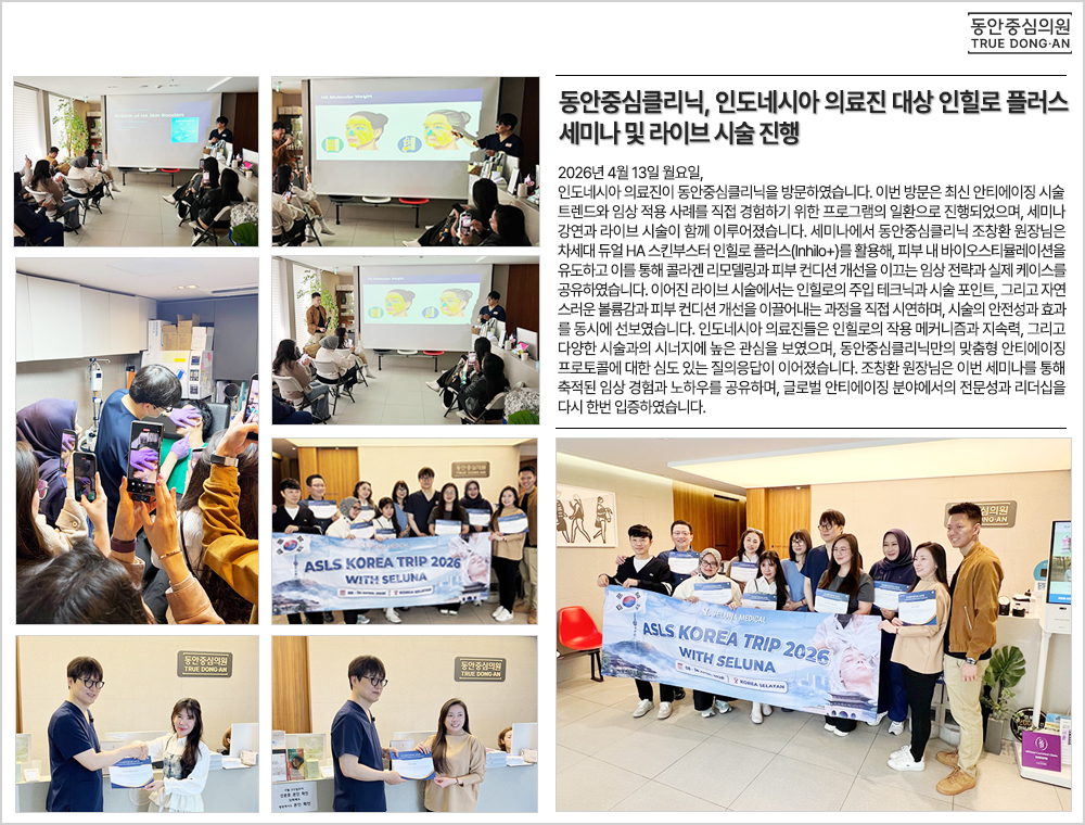 | 153 | 동안중심클리닉, 인도네시아 의료진 대상 인힐로 플러스 세미나 및 라이브 시술 진행 | 2026.04.04 | 26 |