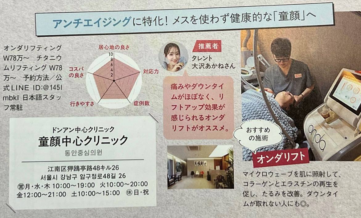 STORY 2026년 1월호 게재 소식 동안중심클리닉이 일본 여성 매거진 STORY 2026년 1월호 ‘어른을 위한 최고의 한국 뷰티 여행’ 특집에 소개되었습니다. 동안중심클리닉은 안티에이징에 특화된 클리닉으로 절개 없이 자연스럽고 건강한 동안 얼굴을 추구하며 통증과 다운타임이 적은 리프팅·피부 재생 시술을 중심으로 진료하고 있습니다. 기사에서는 특히 온다 리프팅(Onda Lift) 을 추천 시술로 소개하며, 마이크로웨이브 에너지를 이용해 콜라겐과 엘라스틴 재생을 촉진하고 자연스러운 리프트업 효과를 기대할 수 있는 시술로 설명되었습니다. 또한 탤런트 오오사와 아카네(大沢あかね) 님이 “통증과 다운타임이 거의 없으면서도 리프트업 효과를 확실히 느낄 수 있는 시술”이라며 동안중심클리닉을 추천해 주셨습니다. 앞으로도 동안중심클리닉은 전문의의 직접 진료를 자연스럽고 지속력 있는 안티에이징 솔루션을 제공하겠습니다. ![]() |