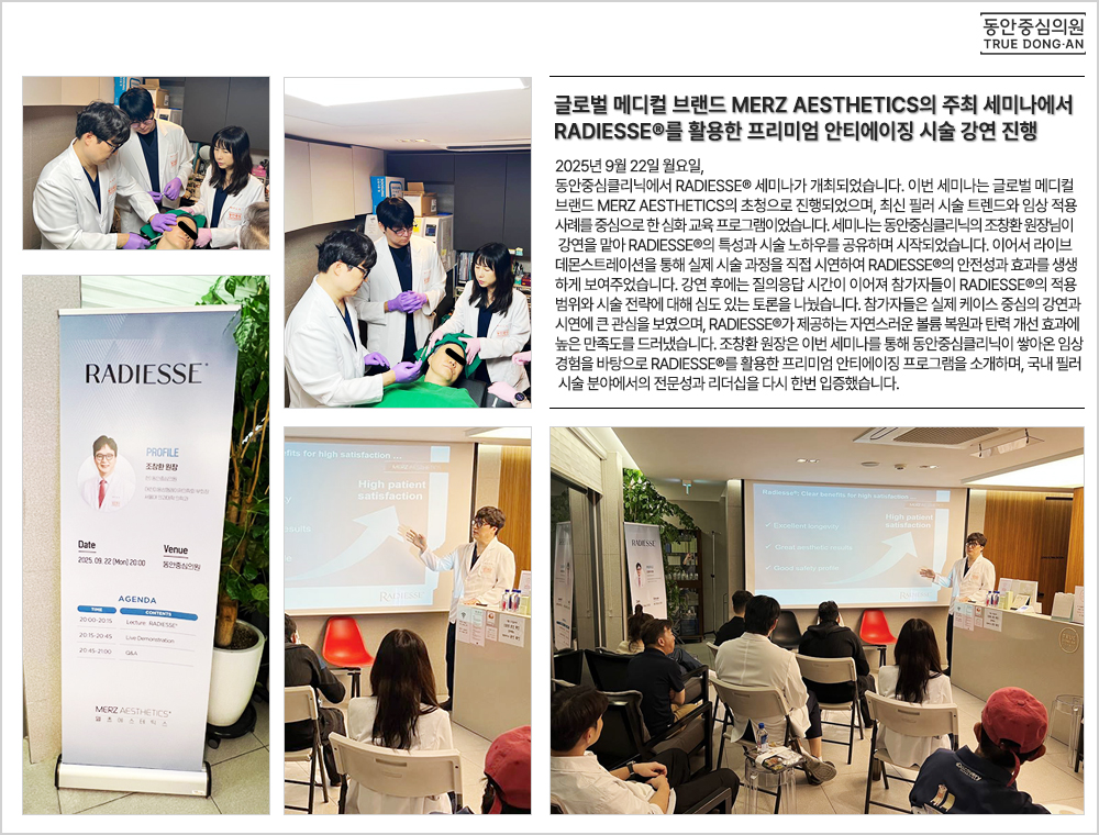 2025년 9월 22일 월요일, 동안중심클리닉에서 RADIESSE® 세미나가 개최되었습니다. 이번 세미나는 글로벌 메디컬 브랜드 MERZ AESTHETICS의 초청으로 진행되었으며, 최신 필러 시술 트렌드와 임상 적용 사례를 중심으로 한 심화 교육 프로그램이었습니다. 세미나는 동안중심클리닉의 조창환 원장님이 강연을 맡아 RADIESSE®의 특성과 시술 노하우를 공유하며 시작되었습니다. 이어서 라이브 데몬스트레이션을 통해 실제 시술 과정을 직접 시연하여 RADIESSE®의 안전성과 효과를 생생하게 보여주었습니다. 강연 후에는 질의응답 시간이 이어져 참가자들이 RADIESSE®의 적용 범위와 시술 전략에 대해 심도 있는 토론을 나눴습니다. 참가자들은 실제 케이스 중심의 강연과 시연에 큰 관심을 보였으며, RADIESSE®가 제공하는 자연스러운 볼륨 복원과 탄력 개선 효과에 높은 만족도를 드러냈습니다. 조창환 원장은 이번 세미나를 통해 동안중심클리닉이 쌓아온 임상 경험을 바탕으로 RADIESSE®를 활용한 프리미엄 안티에이징 프로그램을 소개하며, 국내 필러 시술 분야에서의 전문성과 리더십을 다시 한번 입증했습니다. ![]()  |