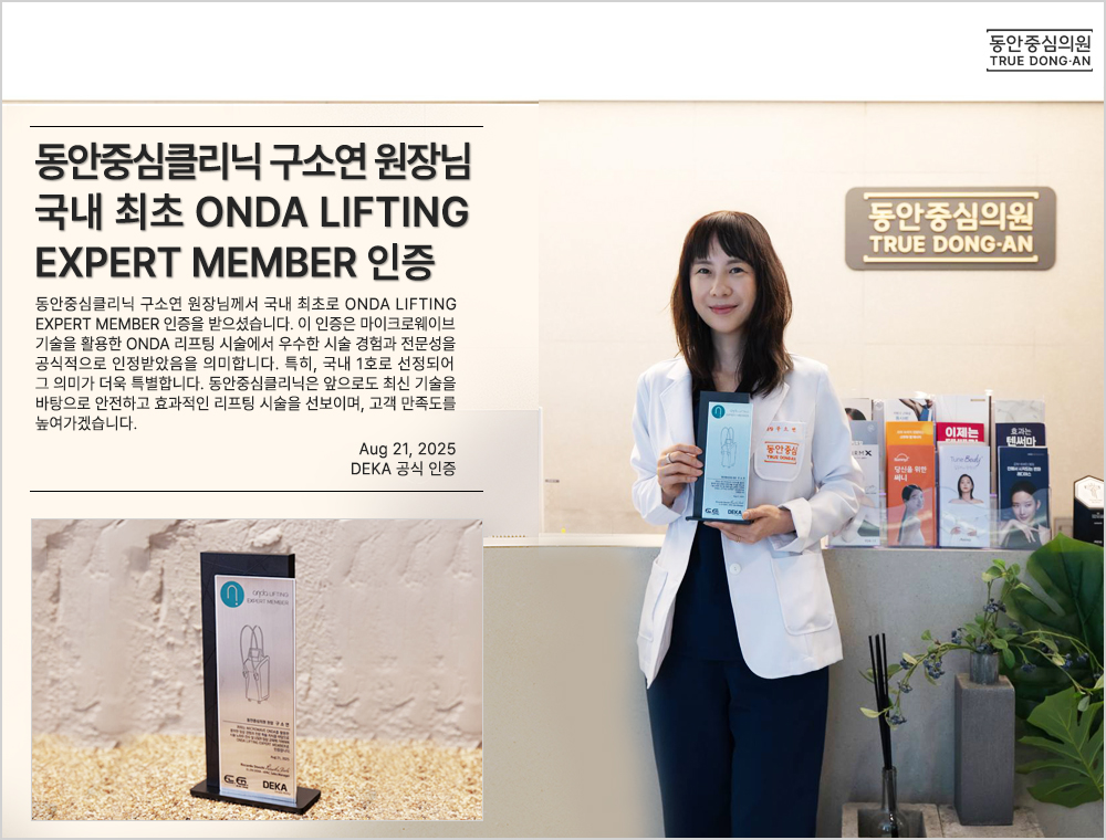 동안중심클리닉 구소연 원장님께서 국내 최초로 ONDA LIFTING EXPERT MEMBER 인증을 받으셨습니다. 이 인증은 마이크로웨이브 기술을 활용한 ONDA 리프팅 시술에서 우수한 시술 경험과 전문성을 공식적으로 인정받았음을 의미합니다. 특히, 국내 1호로 선정되어 그 의미가 더욱 특별합니다. 동안중심클리닉은 앞으로도 최신 기술을 바탕으로 안전하고 효과적인 리프팅 시술을 선보이며, 고객 만족도를 높여가겠습니다. Aug 21, 2025 DEKA 공식 인증 ![]()  |