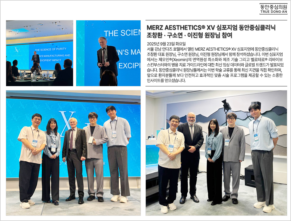 2025년 9월 23일 화요일 서울 강남 안다즈 호텔에서 열린 MERZ AESTHETICS® XV 심포지엄에 동안중심클리닉 조창환 대표 원장님, 구소연 원장님, 이진형 원장님께서 함께 참석하셨습니다. 이번 심포지엄에서는 제오민®(Xeomin)의 면역원성 최소화와 제조 기술 그리고 벨로테로® 리바이브 스킨부스터와의 병용 치료 가이드라인에 대한 최신 임상 데이터와 글로벌 트렌드가 발표되었습니다. 동안중심클리닉 원장님들께서는 이번 학술 교류를 통해 최신 지견을 직접 확인하며, 앞으로 환자분들께 보다 안전하고 효과적인 맞춤 시술 프로그램을 제공할 수 있는 소중한 인사이트를 얻으셨습니다. ![]()  |