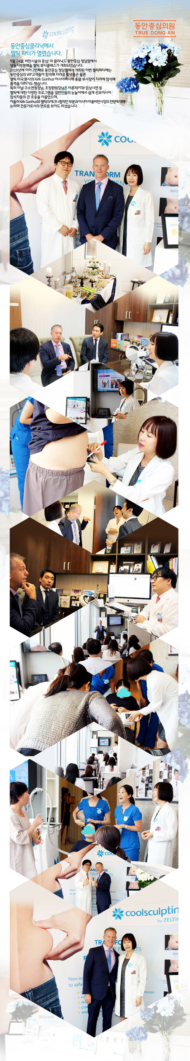 2020년 9월 24일, 동안중심클리닉에서 젤틱 파티가 열렸습니다. 9월24일, 비만시술의 중심! 동안중심클ㄹ닉에서 냉동지방분해술 젤틱 뷰티클래스가 개최되었습니다. 2019년에 이어 2번째로 동안중심클리닉에서 개최된 이번 젤틱 파티에는 동안중심클리닉의 VIP고객분들께서 참여해 자리를 빛내주셨음은 물론 미국 젤틱 본사의 Kirk Gunhus 아시아퍼시픽 통괄 부사장이 자리에 참석해 품격을 더했습니다. 특히 이날 구소연 원장님, 조창환 원장님은 이론적 PT와 임상시연 등 젤틱에 대한 다양한 프로그램을 일반인들의 눈높이에서 쉽게 선보이시어 참석자들의 큰 호응을 이끌었으며, 아울러 Kirk Gunhus와 젤틱의 테니크컬적인 부분과 아시아 미용비만시장의 전망에 대해 논하며 전문가로서의 면모를 보이기도 하셨습니다. ![]() |