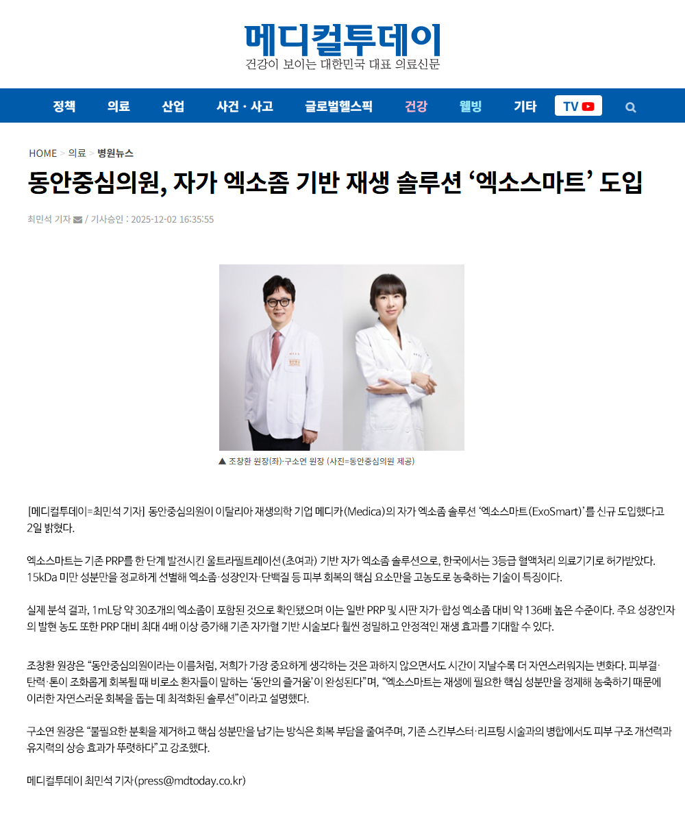 | 14 | 동안중심의원, 자가 엑소좀 기반 재생 솔루션 ‘엑소스마트’ 도입 | 2025.12.12 | 94 |