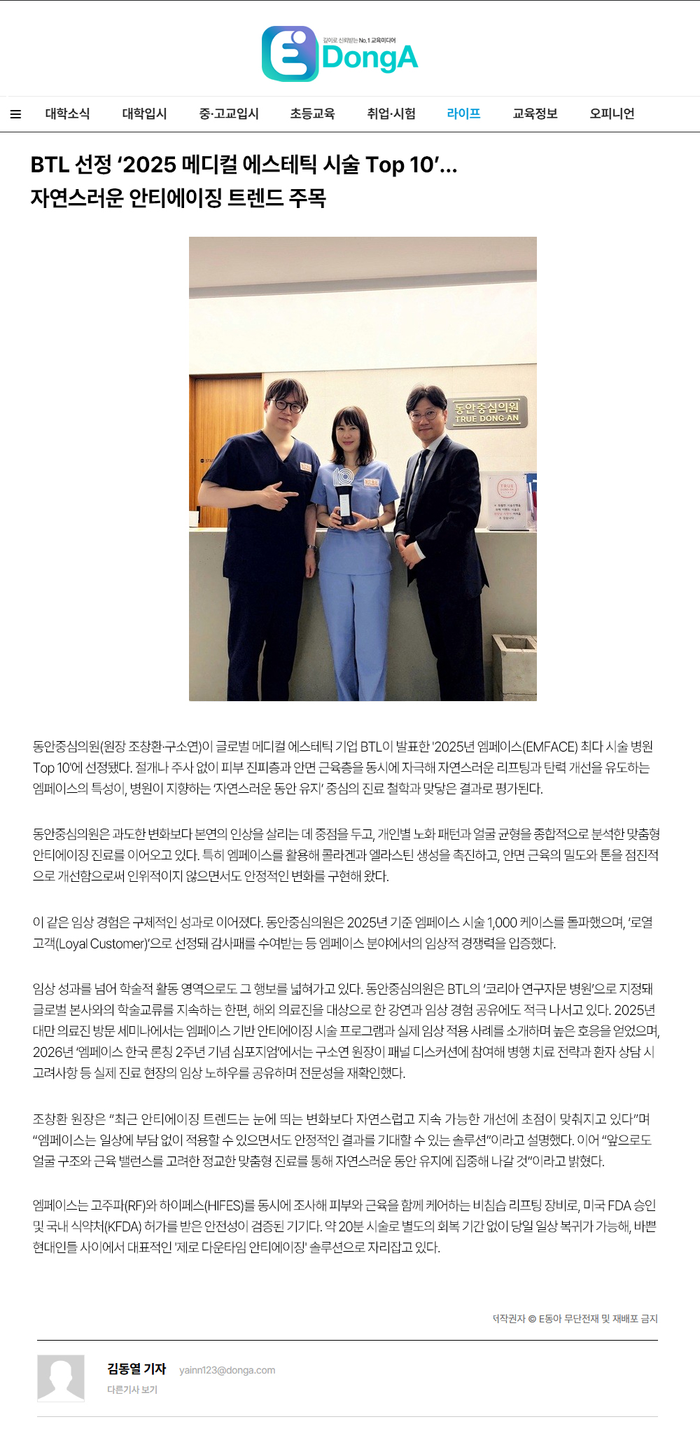 | 16 | BTL 선정 ‘2025 메디컬 에스테틱 시술 Top 10’…자연스러운 안티에이징 트렌드 주목 | 2026.04.04 | 14 |